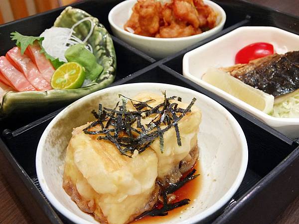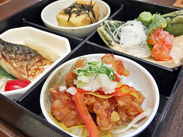 為了突顯季節和食材之間的關連,元定食的松花堂御膳,也以「四季」為主題:春之鹽烤鯖魚、夏之雞肉唐揚、秋之鮭生魚片、冬之揚出豆腐各據一格,不管哪個季節,都遵循「新鮮食材」、「簡單調味」的原則,清爽自然。即便是雞肉唐揚這道炸物,也因為以南蠻醋醃漬過,而變得不油膩且爽口。