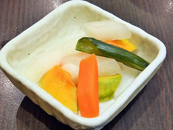 松花堂御膳上桌時,別急著嚐主菜,先將餐前果醋飲下,更能清爽脾胃、打開味蕾。另外我也很喜歡漬物中的醃漬南瓜,因為平時吃到的南瓜多半是蒸熟蒸軟的,但做成漬物,卻讓人吃到南瓜最原始的清脆口感,且主廚用梅汁醃漬,微酸微甜的梅汁和南瓜本身的甜度相融合,感覺更甘美。